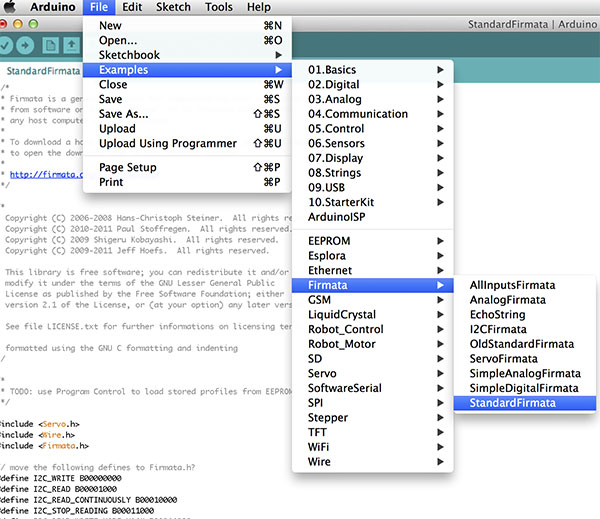 We’re going to use NodeJS to control an Arduino through the USB port of the board using a library called Johnny Five. That library interacts with the Arduino using the Firmata protocol, wich must be loaded to the microcontroller.
