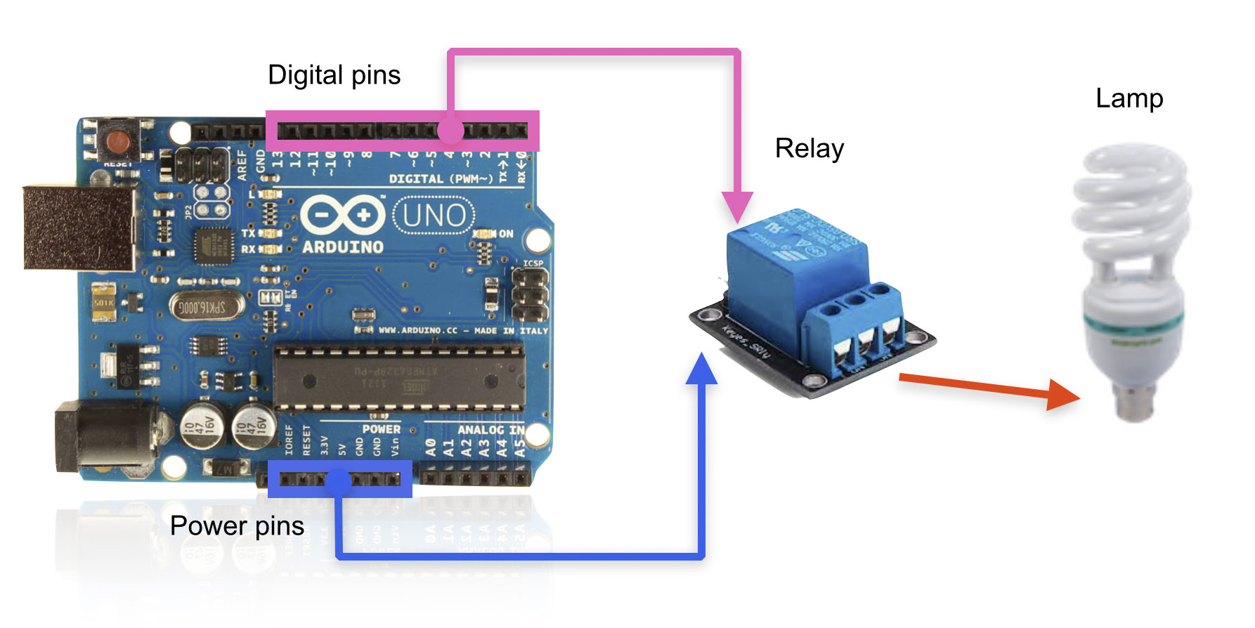 In summary, where are going to tell the Arduino to turn ON or OFF a given pin, and that will trigger the relay to turn on or off the lights.
