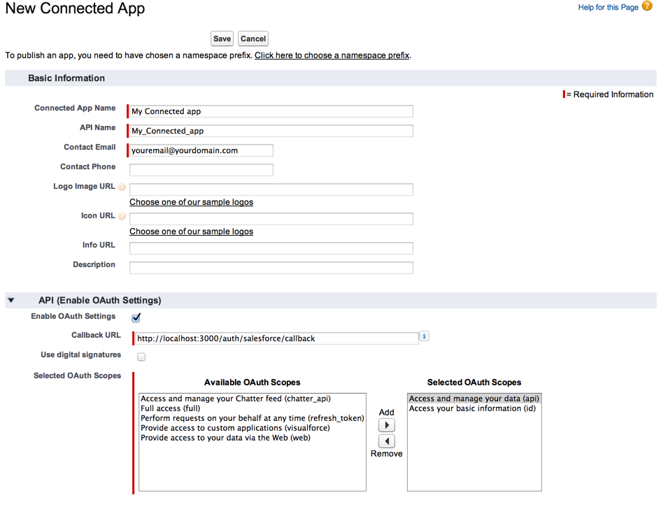 Fill the required fields with information about your app, and check “Enable OAuth Settings”: