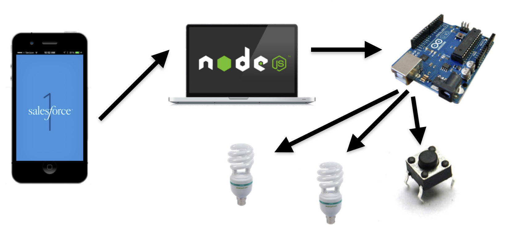 $ npm install johnny-five nforceThen we’re going to create a file called app.js that will have basically the following structure (see the comments for explanation of every section):