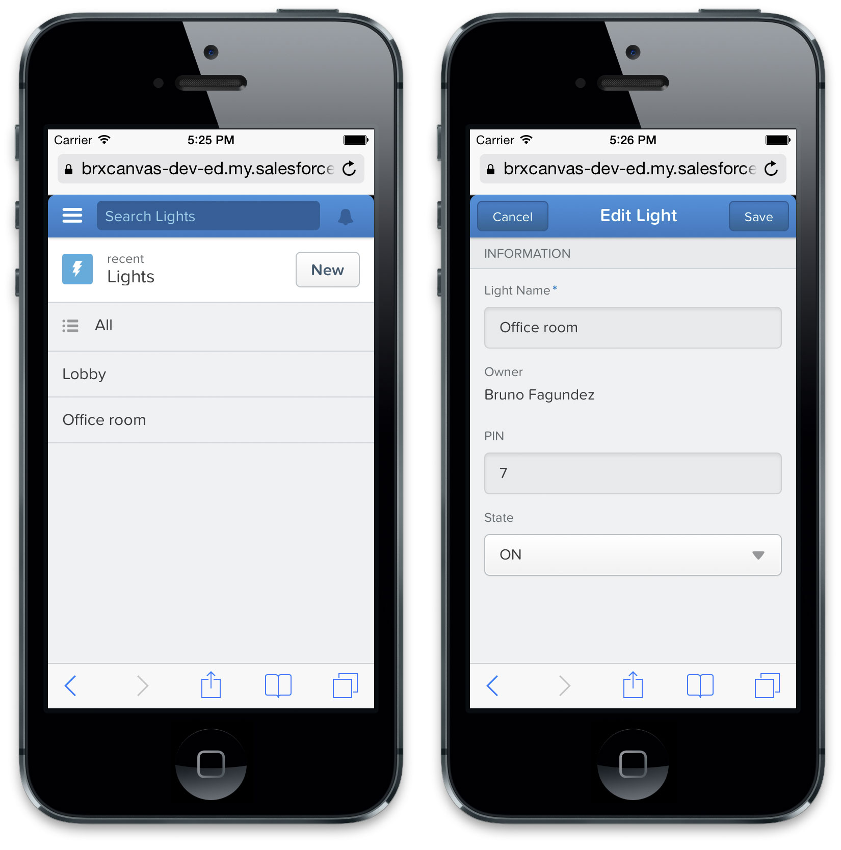 $ node app.jsLogin to your org using SF1 and go to the lights object: